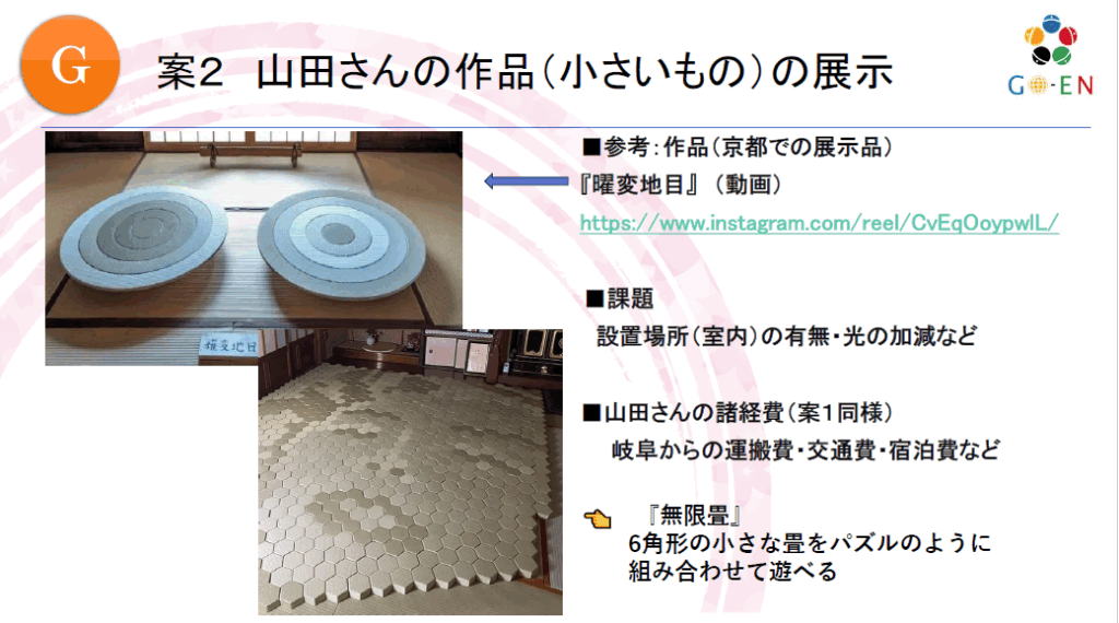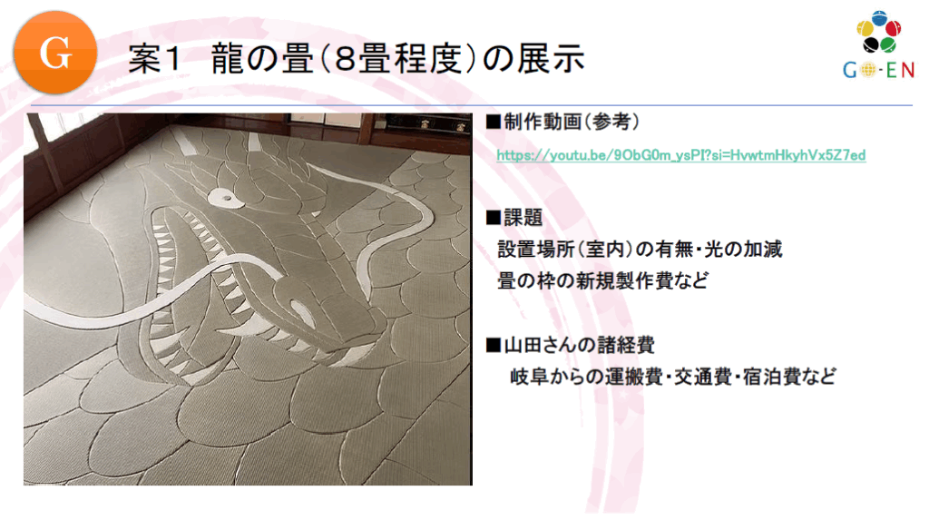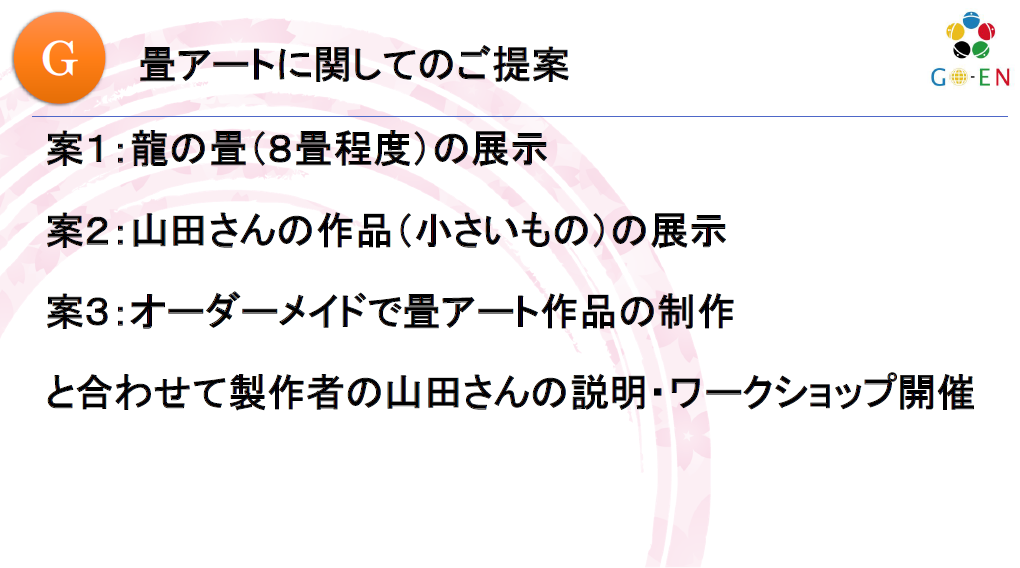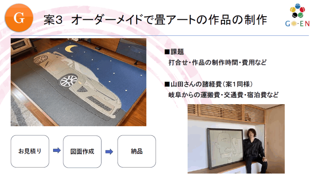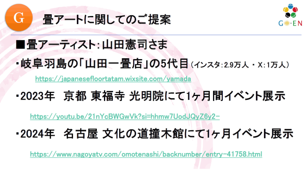 「畳アート」「すごい畳」を活用したイベントのご提案です (2025年9月) ■畳アーティスト:山田憲司さまの畳アートの作品を利用可能ですみなさまの地域でのイベントで展示、海外での富裕層向けのイベントで展示、ミニ畳作り体験とのコラボ企画など更に、畳アート作品の「オーダーメイド」も承ることが可能です。ご興味のある方は「お問い合わせ」からご連絡・ご相談お待ちしております。 「畳アート(すごい畳)」の詳細は こちらから 「仙台まちあるき」体験レポート 前の記事 【ご提案 資料】ミニ畳作り体験プラン 次の記事