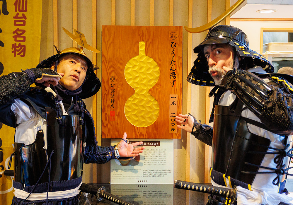 伊達政宗の甲冑を中心に伊達藩の黒の甲冑を身にまとい、必勝祈願の参拝をしたり、仙台名物のずんだ餅を食したりとその姿はまるで城下の様子を視察するお殿様。